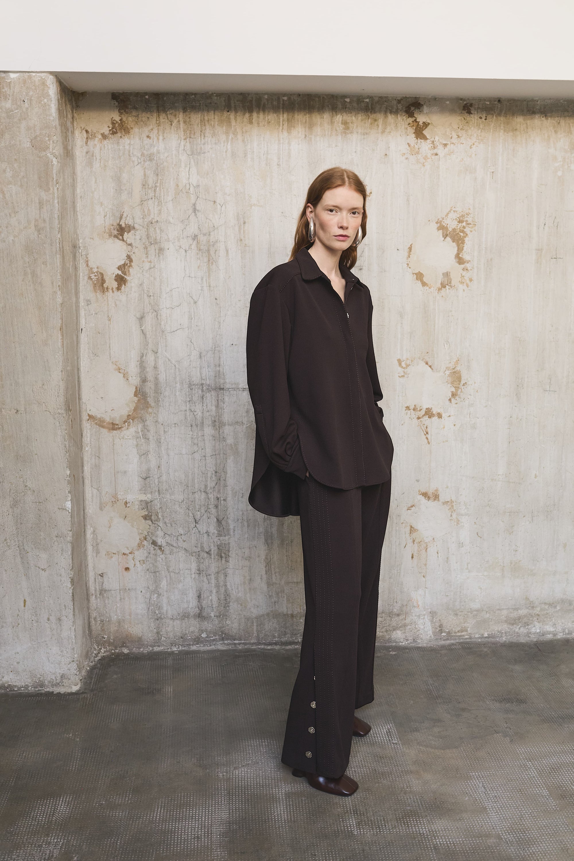 From wide-leg trousers to slim tailored pants, our collection enhances movement and modern proportions. These pieces are designed to pair effortlessly with sustainable blazers, tees, or silk shirts, transitioning with ease from work to weekend.