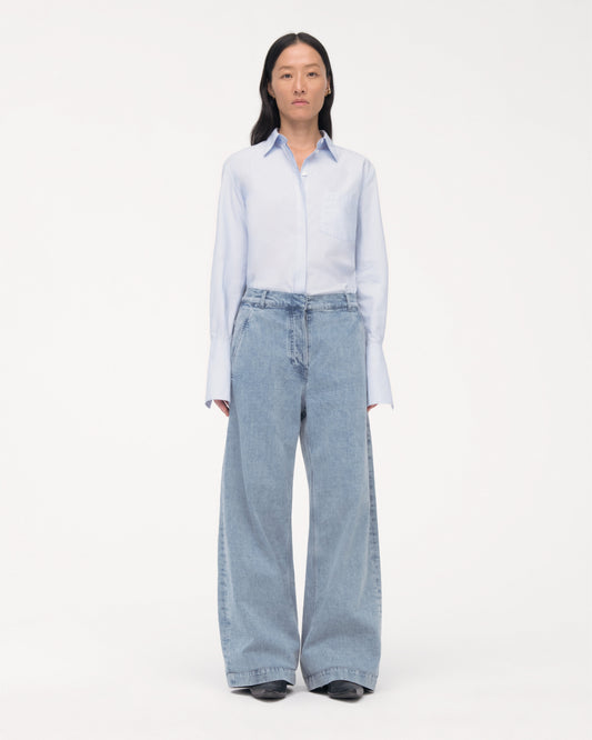 Our iconic Wide Leg Pant joins the classic tailoring lineup as a quintessential modern trouser. This high waisted style sits at the true waist and falls full-length down the leg, elongating the body. The style runs small, and we recommend sizing up.