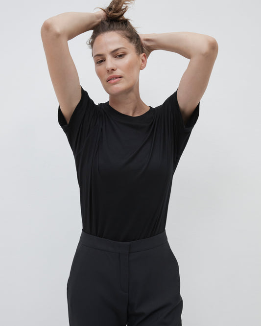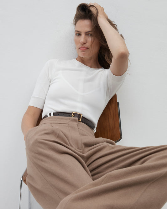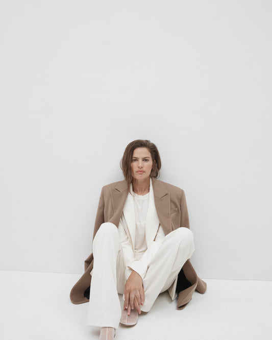 Fall 2025 is a return to tactile richness, from sumptuous cashmere and ultra-fine merino wool to airy peace silks and relaxed fresh denim silhouettes - as photographed on Cameron russell. This collection explores a language of form inspired by American photographer and painter, Saul Leiter, where sculptural volumes meet precision tailoring in consciously engineered fabrics.