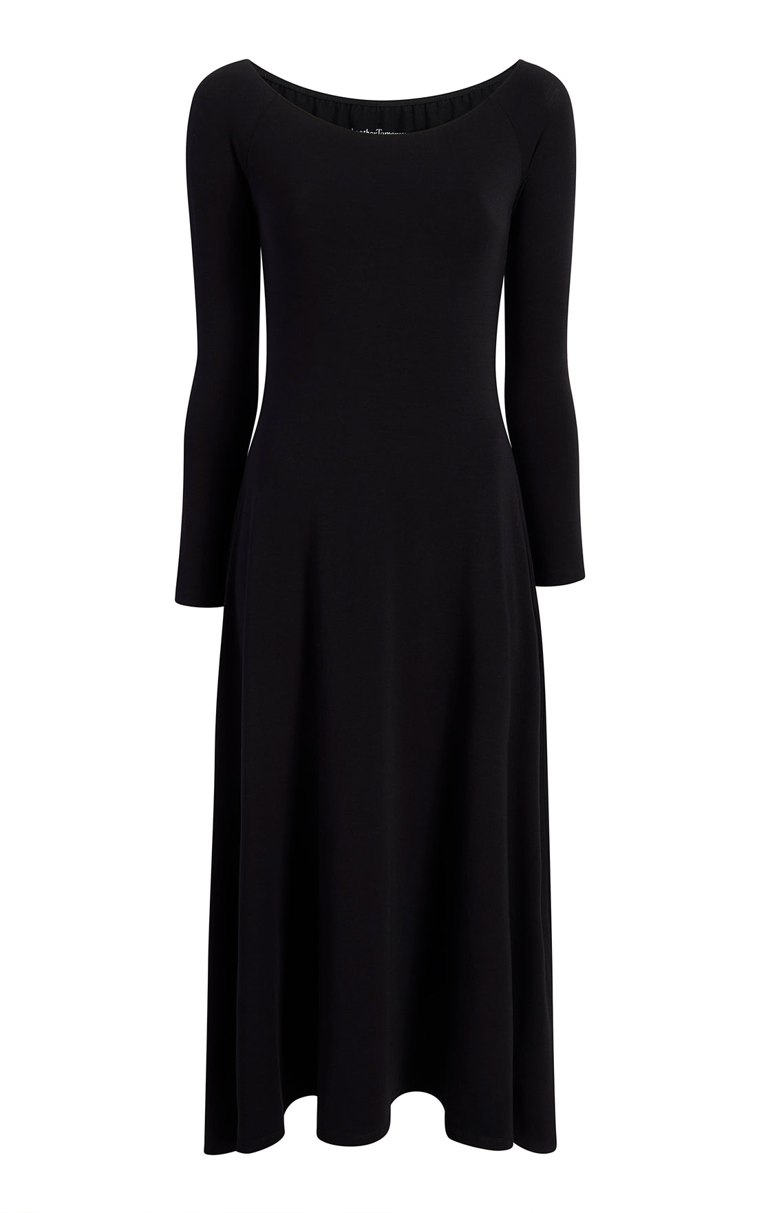 Nodding to the silhouettes of 20th-century modern dance, our Leotard Dress has a fitted bodice and flowy A-line skirt with an asymmetrical hem. The wide neckline sits right at the shoulder caps, allowing the dress to be easily pulled on. The Boucle Cocoon Jacket pairs well, with its convex shape contrasting to the more snug fit of the dress.